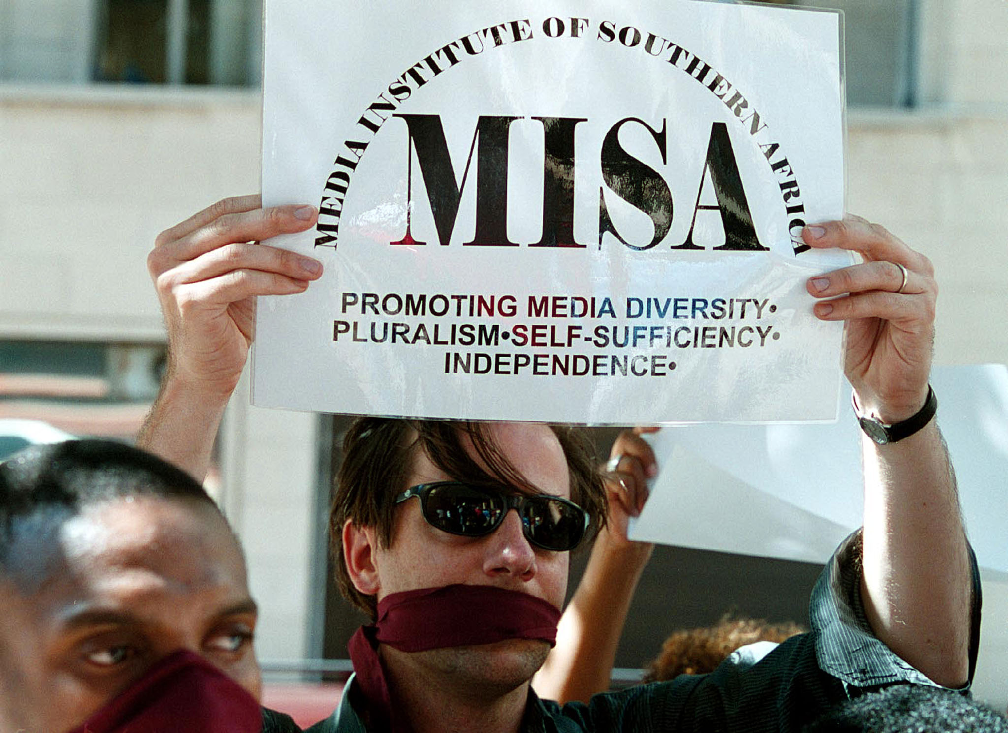 A gagged protester holds a placard of the Misa Media Institute of Southern Africa during a march held in Johannesburg 18 January 2002 to oppose against Zimbabwe ‘governments new media laws.